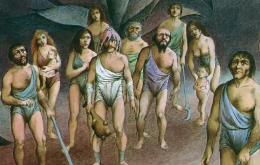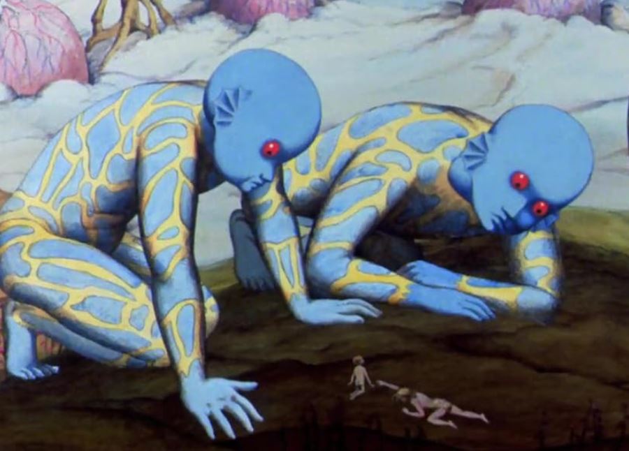 It’s called Fantastic Planet, and it’s a French animated movie from 1973. The visual style of it reminded me a little of that of the great Terry Gilliam and his work for Monty Python. In this film, we learn that in the distant future, the gargantuan blue humanoid Draags have brought human beings (who are called Oms as a play on the French word for “man”, homme) from Earth to the planet Ygam, where the Draags maintain a technologically and spiritually advanced society. The Draags consider Oms animals, and while they keep some as pets, others live in the wilderness and are periodically slaughtered by the Draags to control their population. Draags have much longer lifespans than Oms, but reproduce much less.