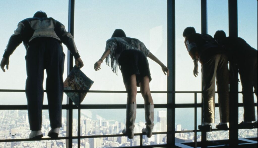 What leapt out first, to both of us, was how seeing the film widescreen revealed details that pan-and-scan versions, or whatever cropping techniques cable television has used, had strongly affected the way that each of us took in certain scenes. She had never noticed, for instance, that in the sequence where our intrepid teenagers lean against the observation windows near the top of the Sears Tower, at the far-right of frame, there are a pair of older men, nonchalantly chatting in German and wearing inexplicable psychedelic fish-headwear.