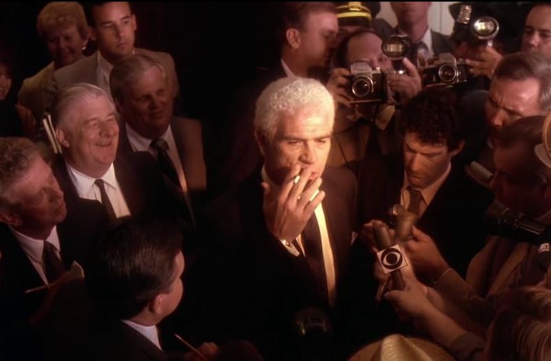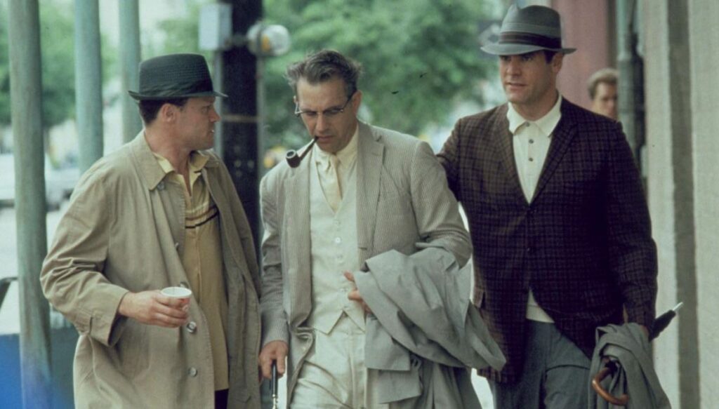 Well, after forty-odd minutes I had no idea what was going on. It seemed to be little more than the pipe-smoking New Orleans District Attorney Costner (having become obsessed with the murder after digesting the Warren Report) wandering around talking to people. The narrative structure is most unsatisfactory, consisting of short scenes that mix real-life footage, still photos, newscasts, black and white recreations of shady meetings and events, and the present-day Costner and his bland deputies interrogating the next dude.