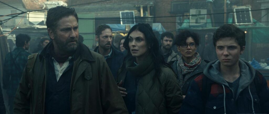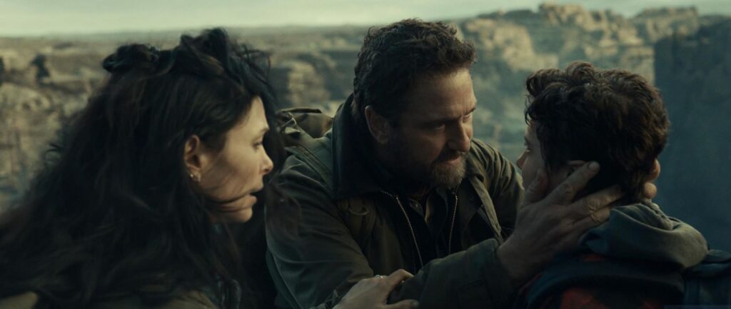 Greenland 2 picks up five years after comet Clarke smashed into the Earth. Even though the end of the first film showed people leaving the bunker after just nine months and declaring the atmosphere to be clearing up, John Garrity (Gerard Butler) and his fellow survivors are still hunkered down in the Greenland bunker five years later. In a long, long voice-over narration, John hilariously explains that more chunks of the comet unexpectedly crashed into the planet. Or he said, “hit us completely by surprise” or “came out of nowhere” or something very similar to that affect. It’s hard to remember because my friend and I were laughing at hearing this nonsense spoken out loud.