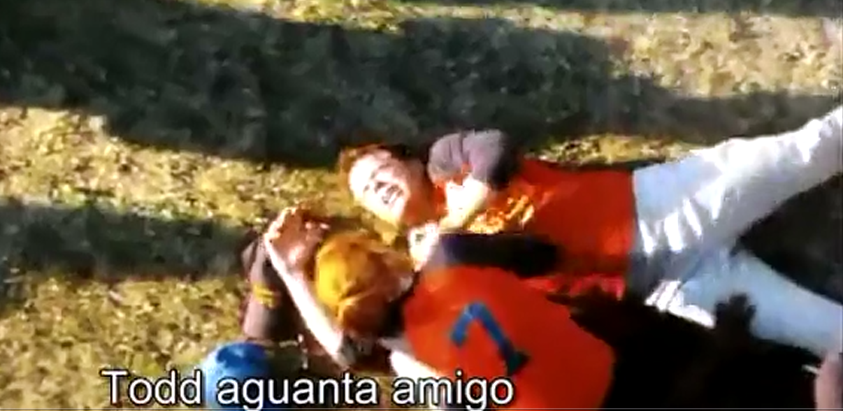 After church (the event not the Thomas Hayden) there is a softball game and Todd, who has a swing that reminds apple pies of freedom, belts a stand-up double to left. Jesus, who is coaching third base, tells him to hold up, but Todd wants to stretch this into a triple, to pay homage to the holy trinity. As he slides into third, he breaks his leg.