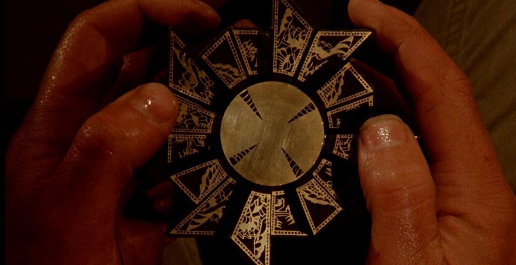 A wood-and brass puzzle box that, when solved, will take the solver to a realm of hell where he will be tortured by shit the sane mind cannot comprehend.