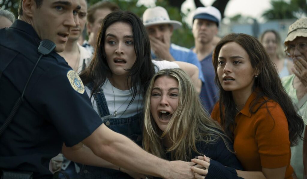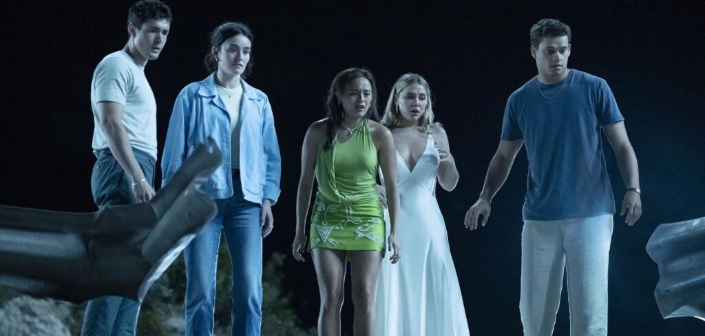 This time, reunited friends Danica (Madelyn Cline), Ava (Chase Sui Wonders), Milo (Jonah Hauer-King), Teddy (Tyriq Withers), and Stevie (Sarah Pidgeon) are watching fireworks from the side of a road on a cliff with a blind curve. A car comes speeding around the bend, swerves to avoid hitting Teddy, crashes into the guard rail, and plummets to the ground below. Teddy calls 9-1-1, then convinces the group that they need to leave before the cops and paramedics show up. But why? Even if they were worried they could be blamed, the obvious lie is to just tell the cops the car was speeding around the curve and lost control, simply leaving out the part where Teddy was standing in the road. They even tried to stop the car from falling when it was teetering on the cliff’s edge. Not only is this a scenario where fleeing the scene and keeping it a secret makes no sense, talking to the cops and fibbing would have strengthened the killer’s motivation.