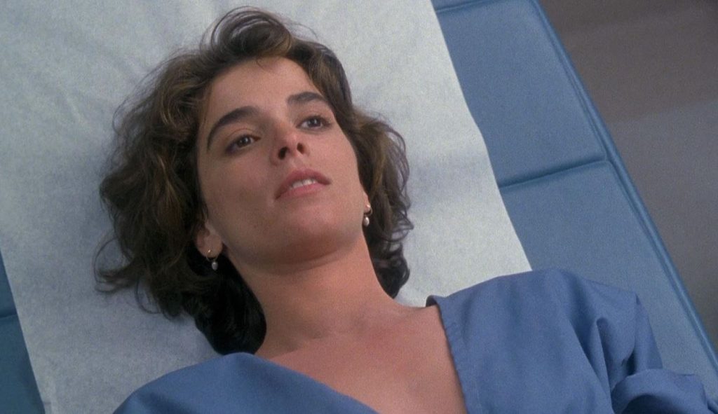 I’m also glad I don’t have to hand over good money for an (invariably male) doctor to examine and prod my rude bits. Just look at happy-about-to-become-unhappy housewife Claire Bartel (Annabella Sciorra). She’s preggers and so pops along for a first consultation with her obstetrician, Dr. Mott (John de Lancie). He’s tall, well-groomed, personable, keen to get rid of the attending nurse and even keener to get the gown-wearing Claire flat on her back for a physical examination. As he kneads her breasts, he talks about the weather and his love of taking a walk after a rainstorm. Surely he’s merely trying to put his patient at ease? Something’s not right, though, and it’s showing in Claire’s tight expression. “Relax,” he tells her as he parts her drawn-up knees. And then, in a deeply icky moment, he slyly removes his latex glove and slips it into the pocket of his white coat. Off to work he goes as his other hand caresses her swollen belly.