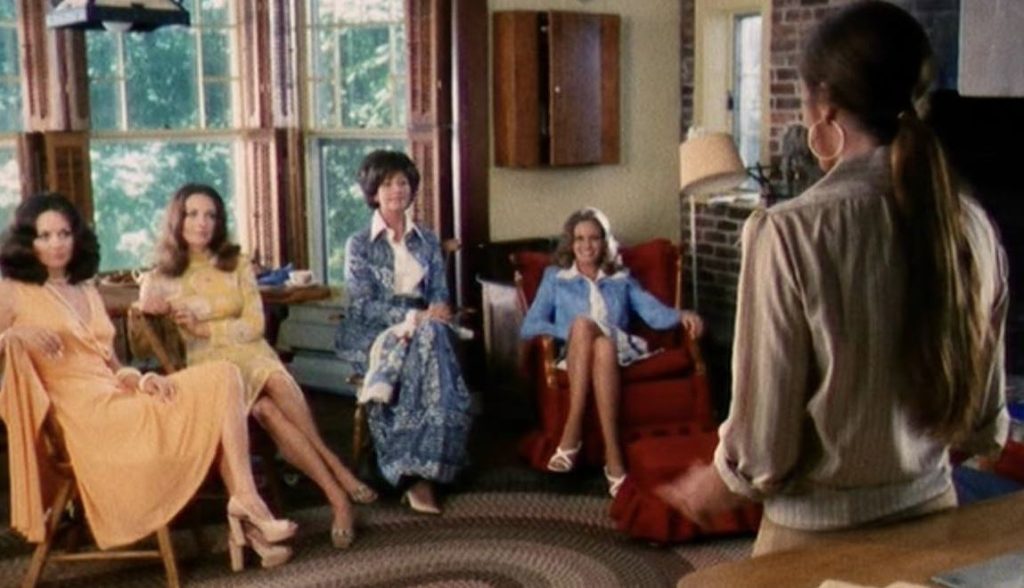 Well, in the little town of Stepford the problem’s been solved by the far-reaching ingenuity of men, although our two suspicious heroines Joanna and Bobbie (Katharine Ross & Paula Prentiss) oddly believe something is amiss. How on Earth can they feel this way when there’s so much confirmation that Stepford’s women are happy? Stupidly, they try to get the town’s sisters to abandon their submissive, house-proud ways, even when continually presented with firsthand evidence of their bliss. For example, observe their little afternoon trip to Frank and Patricia’s home in which they inadvertently overhear the upstairs couple having sex. “Oh, yes! Oh, yes!” the unseen Patricia moans. “Nobody’s ever touched me the way you touch me. You’re the best, Frank. Oh God you’re the king. You’re the champion, Frank. Oh, you’re the master!”