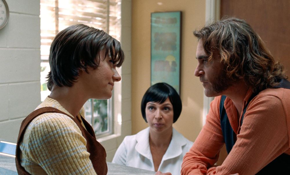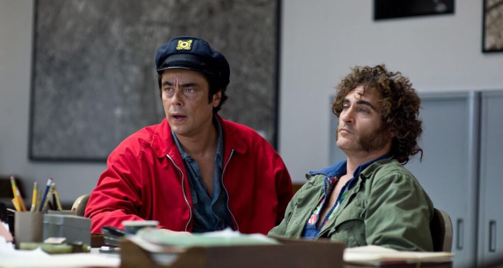 With: Joaquin Phoenix as Larry “Doc” Sportello, a stoner PI, Josh Brolin as Lieutenant Christian F. “Bigfoot” Bjornsen, a fascist cop and sometimes TV extra, Owen Wilson as Coy Harlingen, a rat, Katherine Waterston as Shasta Fay Hepworth, a hippy chick, Reese Witherspoon as Deputy District Attorney, a waste of a good actress, Benicio del Toro as Sauncho Smilax, Esq., a stoner lawyer. A waste of a good actor, Joanna Newsom as Sortilège, who is also the narrator, Jeannie Berlin as Aunt Reet, real estate maven. A day player, Maya Rudolph as Petunia Leeway, another day player, Michael Kenneth Williams as Tariq Khalil, Michelle Sinclair as Clancy Charlock, Martin Short as Dr. Rudy Blatnoyd, D.D.S. Comic relief, Sasha Pieterse as Japonica Fenway, Martin Donovan as Crocker Fenway, Eric Roberts as Michael Z. “Mickey” Wolfmann, a real estate developer. Really, where?
