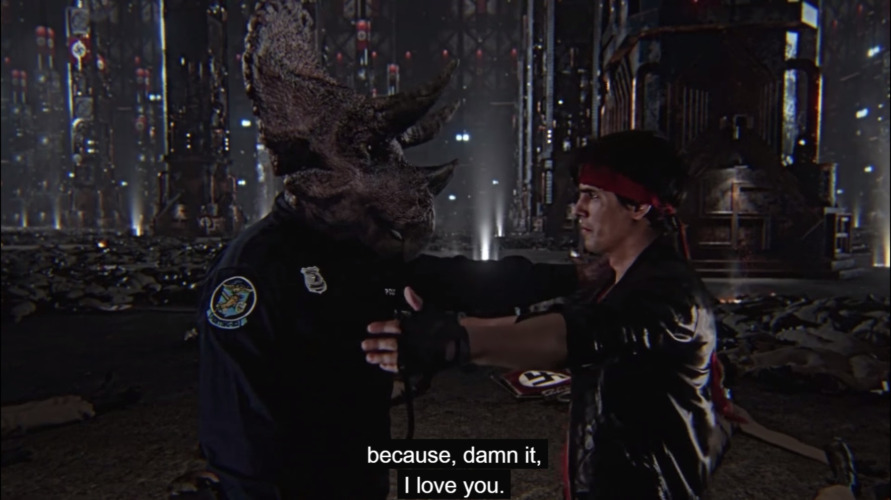 Sergeant Kung Fury is a loose amalgamation of 80s Action loner hero loose cannon stereotypes, but he also possesses the 21st century computer-enhanced moves of Mortal Kombat heroes Johnny Cage, Liu Kang, Jax, Scorpion et al, so almost every violent encounter is a novelty injury or novelty death. One that sticks out is when he uses a Nazi as a skateboard, then grabs him and pummels him back and forth, like a gorilla at the gym learning to do mad Russians with a human-sized medicine ball, until the brainwashed bigot somehow loses all his limbs.