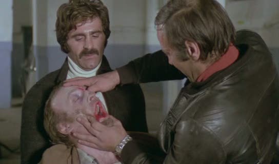 Coming from the helmer of that Cannibal holocaust thing, I expected a treat… and I wasn’t disappointed. The movie is far from gory by current standards, but it has mean-spiritedness in spades. Two robbers on a motorcycle grab the purse of a woman coming off a bank; since the woman has the purse chained to her wrist, she’s dragged along until bumping head-first onto a lamp post, which is followed by one of the robbers kicking the bejesus out of her as if that would break the chain. A guide dog is run over, leaving its blind owner stranded in the middle of a crossing. Blondie and Blackie leave two hapless bouncers bound and gagged on the ground, douse gas in a circle around them and light it just for kicks. A treacherous heroin addict is punished by Pasquini’s henchmen by having one of his eyeballs pushed into his skull. A couple of low-ranking thugs are tied to a ceiling beam and used as punching bags during an interrogation, with Blackie casually grabbing and twisting their nuts at the same time (!!!)