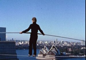 That the act was illegal is obvious, though Petit seemed eminently agreeable, even after arrest (he was eventually “sentenced” to perform a children’s show, and received a lifetime pass to the towers for his trouble). I imagine his fear of the authorities was related to the panic of prevention, not anything that might have occurred post-deed. One could reasonably argue that the high-wire act was the selfish act of a petulant child, what with the expenses incurred by civilian authorities and all. As his Sydney stunt also proved, traffic could be brought to a standstill, and distracted drivers could be a threat to others. But as pompous as it might sound, Petit has every right to insist that his art — or all art, for that matter — need not take notice of niceties or conventions, so long as consequences are respected. If art waited for convenience and passively stood in line, it would cease to be provocative and therefore differ little from wallpaper or inert pavement.