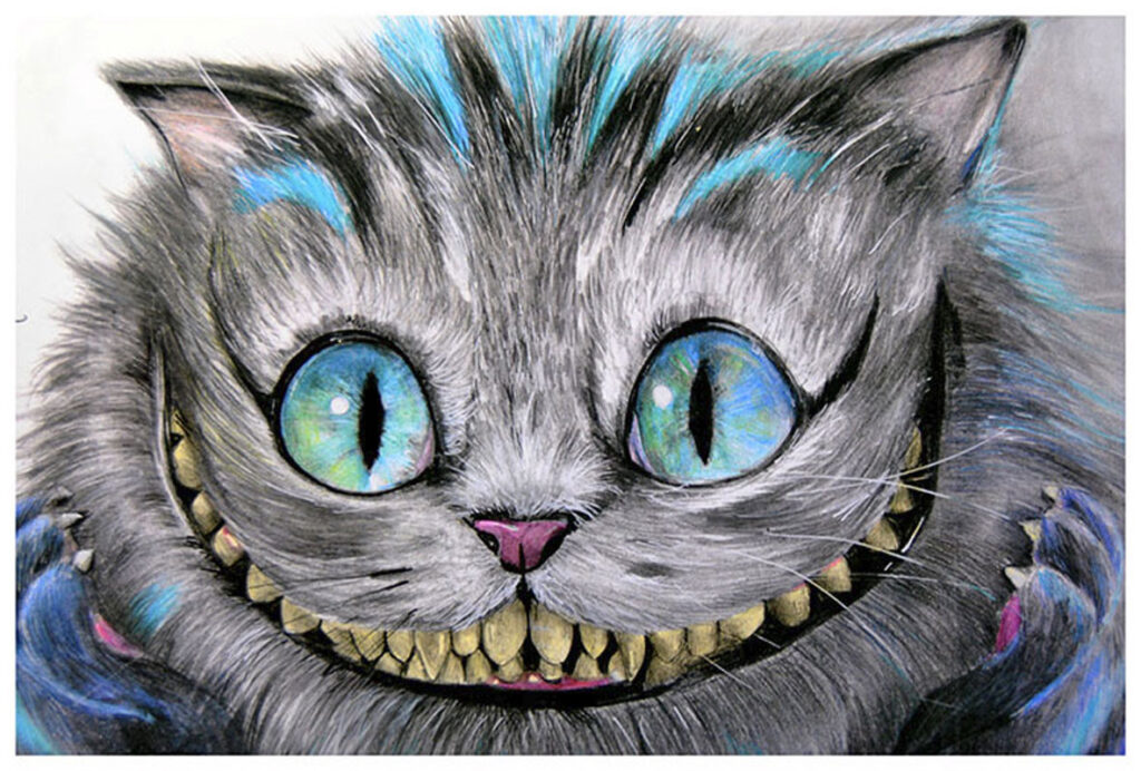 Until POOF! I landed in a world so strange, so wonderful, you wouldn’t believe me if I told you! But I’m going to, anyway! So, listen up! I saw a grin suspended in mid-air, finest feline furry vanishing behind it. Where did you go, you little liar? Was it Cheshire? I saw a caterpillar smoking, blue onto his face, while mad murmurs floated from his lips in little puffs of pale and ghostly smoke. I ate some mushrooms and grew tall, and suddenly I saw, I understood it all! Hatters that were mad and sipping, eternal tea, forever biscuits, dipping, dripping… And then, then came the queen, all red and full of threat and dread, screaming, “Off! Off with that head and dead! Die you shall, you twat!” And so she did, cut off my head, and when I woke up in my bed, I cried and thought, “White rabbits, what’s with that? Rabbits should be green instead!”
