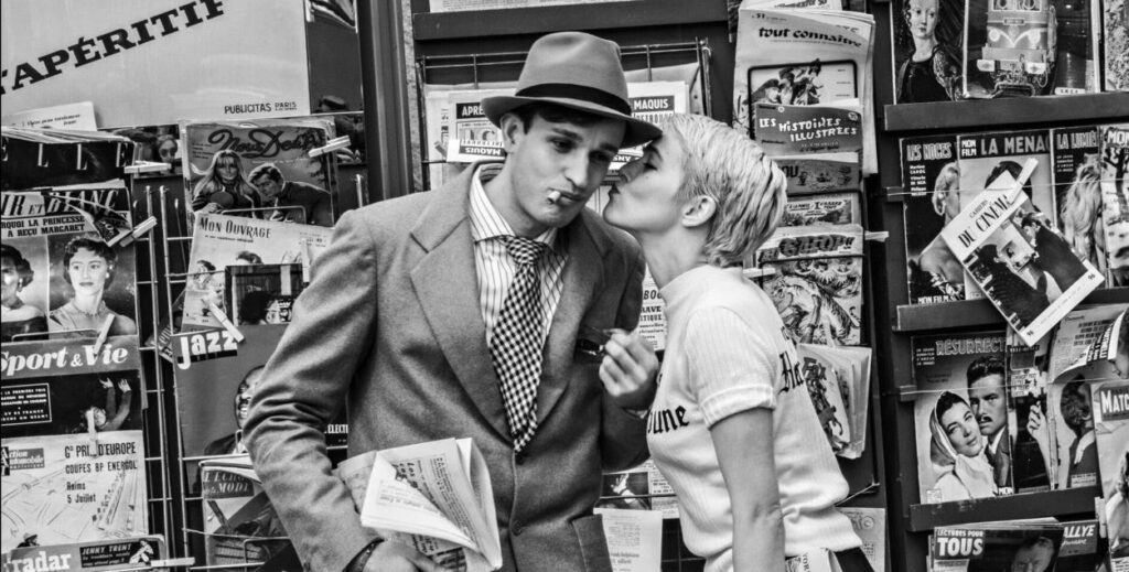 At first it might appear that Nouvelle Vague is but an obvious stunt, using the style, stock, and ironic detachment of the period to traffic in cheap nostalgia, but once things really get going, you realize there’s no other way to tell the tale. Dozens of the period’s brightest lights are on hand (Melville, Truffaut, Rohmer, among others), but rather than identify them through traditional means, they sit, composed, staring straight at us, with their moniker written below. It’s artificial, yes, but a good deal better than having someone whisper, “Hey, isn’t that Agnes Varda?” as she enters the room. We’d have figured that Linklater would know better. He also nailed the casting, preferring low key doppelgangers to big names that would stretch credibility. Lesser men might have given us George Clooney as Godard, but we get Guillaume Marbeck instead. Yeah, me neither, but I’ll be damned if he’s not absolutely perfect. The relative anonymity allows us to become immersed. Which we are, from frame one.