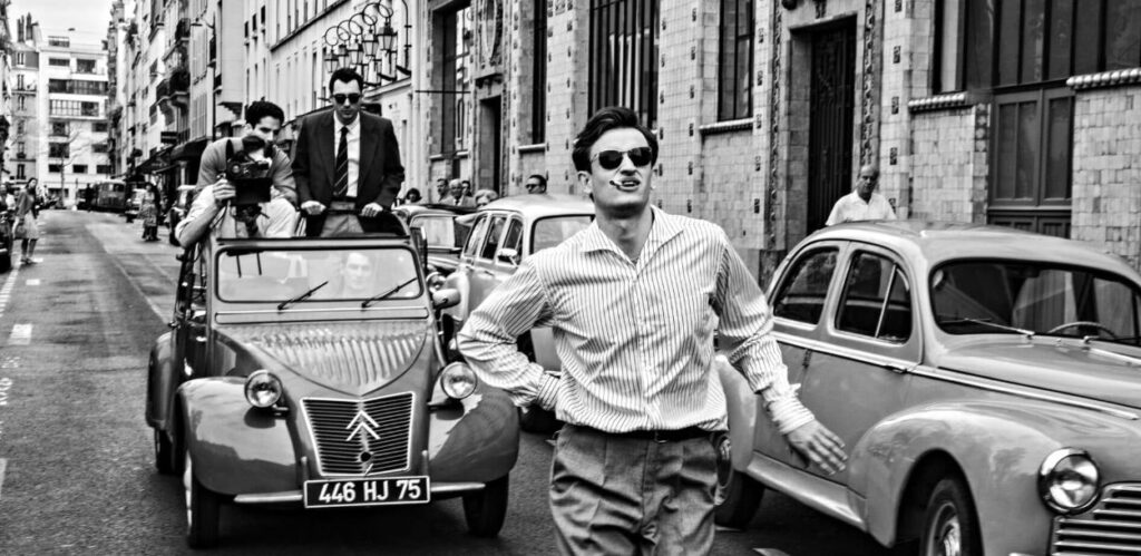 Back to Godard for a moment. If anyone lived his life in opposition, it was him, and there’s a certain beauty in portraying him as an aphorism-obsessed lunatic who chafed at tidying up a bedroom because it ruined the aesthetic. Life is far from linear (isn’t every waking moment a dizzying jump cut?), which speaks to the only quote that matters in such a context: “A story should have a beginning, middle, and an end, but not necessarily in that order.” Pretentious twat, sure, but fuck if he didn’t nail it. He goes on. “All you need to make a movie is a girl and a gun.” These days, not even that. “Cinema is the most beautiful fraud in the world.” Preach, JL. He spits these out as instinctively as breathing.