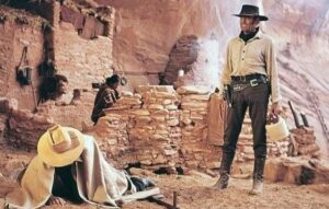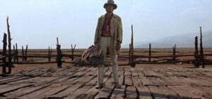 Take the opening credits — nearly ten minutes by my clock — where three hired guns wait at a train depot for an unknown passenger to arrive. The wide screen compositions are as lush and inviting as any I’ve ever seen, and we haven’t yet visited Monument Valley. Leone takes us around the station; from water dripping on a hat, to a pesky fly bothering a napping gunslinger, to a squeaky windmill. In a sense, nothing is happening, yet the tension is almost unbearable. Most of all, we are floored by the audacity. No one speaks and no one does much of anything, yet we know a stranger will be arriving and then, well, who knows? The opening scene is a primer for all that Leone does — and does well — and should be studied at length by all those who believe that fast cuts and blaring action are necessary to thrill an audience. It is telling that Leone cites Akira Kurosawa and Yasujiro Ozu as major influences in that they are all willing to let scenes play as they must without rushing to the next dramatic development.