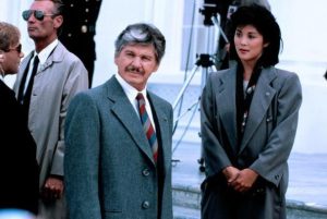 And, in a truly novel turn, not once does she try to murder her lover in the sack. Instead, at the peak of her career inside the White House, she thinks of little else but the bump and grind with a man at least 53 years her senior. An older, mustier man for its own sake, not as a means to move up the company ladder or inspire more sinister deeds. A black chick would have been too sassy, a white woman too ordinary, and a Latina simply unbelievable in a job not involving deep fryers and drive-up windows. No, it took an Asian to win Charlie’s loins. He’s intrigued, but too flummoxed to commit.