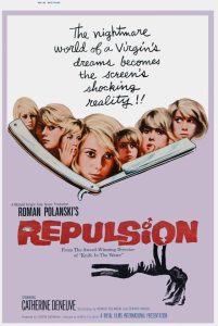 After his one-two punch of Knife in the Water and the superior Repulsion, Roman Polanski appeared poised to become the contemporary answer to Hitchcock. Both are thrillers, minimalist in nature and depend on character development to increase the tension to a palpable degree, but Repulsion shows extraordinary maturity in the skill of its craftsman. A film that was quite controversial in its time, Repulsion focuses its narrow lens upon the fragile state of mind of its protagonist, who is twisted into painful knots of paranoid delusions whilst drowning in an ocean of sexual repression and fear of intimacy. As played by Catherine Deneuve, the character of Carole Ledoux is an opaque, blank-eyed cipher, withdrawn and fearful of the world around her– in particular, men.