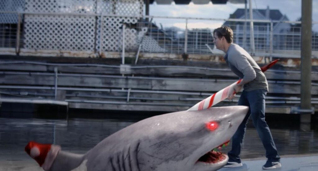 I’ve watched all the Jaws movies, 3 Sharknados and the masterpiece Piranha Sharks with the great John Wells. This shark looked like she was made at a 7th Grade Science Fair by the kids that come in on the smaller bus. I mean, she had red eyes and wore a Santa cap, too. However, this was a shark with an attitude. This was the baddest and raddest shark ever to grace the screen. She (Yes, see the movie) was set off by Christmas anything, music, decorations, lights, etc. Not to spoil things, but this shark was totally ruthless and killed everyone but the baby Jesus in the Nativity scene. She wasn’t hungry either, she just wanted to kill, kill, kill. Bad shark.