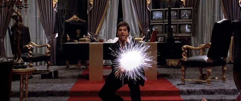 Back home, Tony gets all depressed as shit and dives headfirst into a pile of coke the size of Mount St. Helens. In the meantime, his mansion gets swamped with hordes of Pablo’s bad guys. Oh, no! Tony? Are you watching all the monitors you installed, Tony? Or are you focused on your sister, who suddenly walked into your office wearing nothing but a thin little nightgown that leaves very little to the imagination? And asks you if you want to fuck her? If that’s why you killed Manny? Tony? Do you want me, Tony? And then BAM! Some fucker shoots her dead.