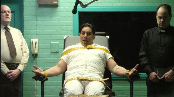 This incisive commentary complements the threat of death hanging over Dead Man’s Matthew Poncelet when his defense attorney stands before an appeal hearing and initially runs through history’s many appalling methods of capital punishment. “Now we have developed a device that is the most humane of all: lethal injection,” he says. “We strap the guy up. We anesthetize him with shot number one. Then we give him shot number two and that implodes his lungs and shot number three stops his heart. We put them to death just like an old horse. His face just goes to sleep while inside his organs are going through Armageddon. The muscles of his face would twist and contort and pull but, you see, shot number one relaxes all those muscles so we don’t have to see any horror show. We don’t have to taste the blood of revenge on our lips while this human being’s organs writhe, twist and contort. We just sit there quietly, nod our heads, and say justice has been done.”