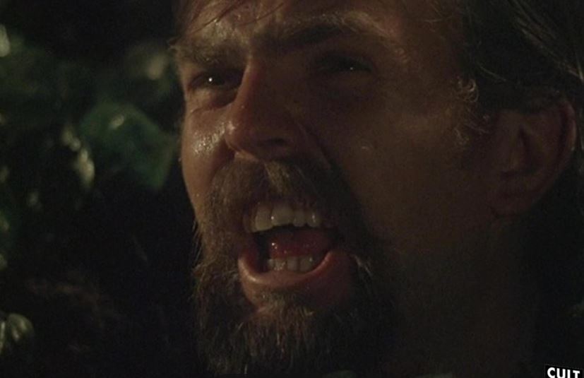 Anyhow, at least the goateed Ratzenberger and co appear to be enjoying life on the road. That is until a demented farmer places a couple of bear traps on the bitumen, causing their stricken van to plunge off the highway. The musicians are then scooped up, taken back to the isolated farm and… planted. That’s because this particular cannibalistic purveyor of processed meat likes to fatten his ‘crops’ before turning them into human sausages. And to add injury to injury, he also removes their vocal cords.