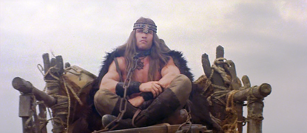 Taking a leaf out of Bronson’s book, his character is none too chatty, although his first line is a pearl. Asked by his master what is ‘best in life’, he does his most intimidating glower and answers with a downturned mouth: “To crush your enemies, see them driven before you and hear the lamentations of their women.”