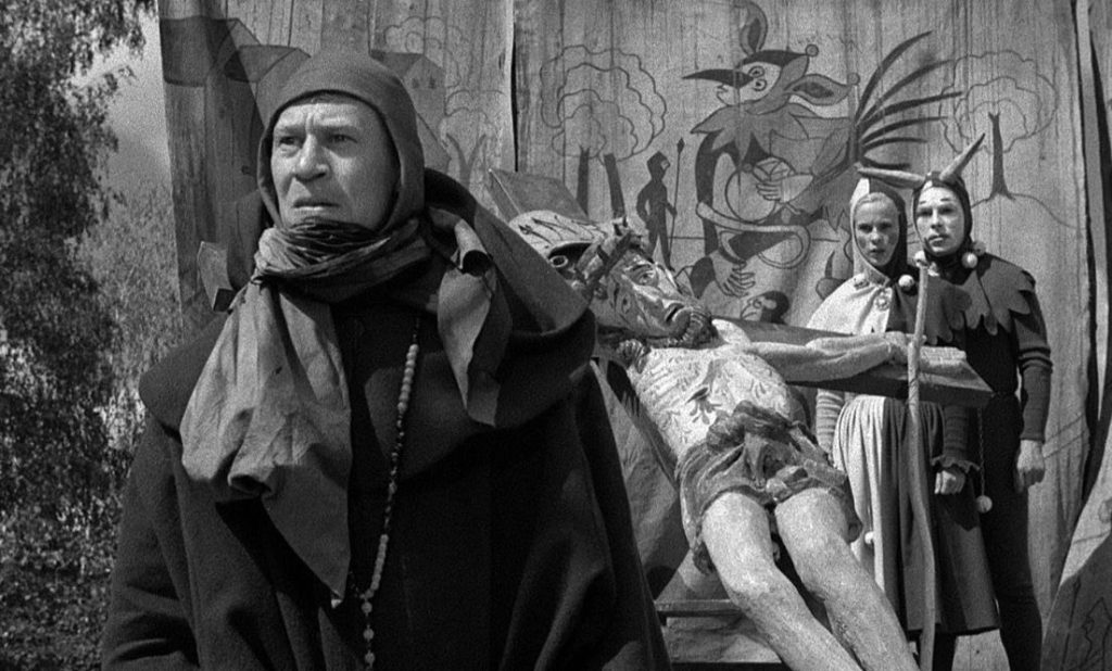 Then again, as this imperious knight wanders through his medieval homeland with a red cross emblazoned on his chest, he is confronted by corpses, an accused witch in the stocks waiting to burn, the maimed, superstition, talk of women giving birth to monsters, the stupid, doom-laden certainty of priests, and a troop of none too happy flagellants. Amusingly, he seems to conclude at one point that the best way to counter the torment of over-thinking and the certainty of death is to take part in simple pleasures.