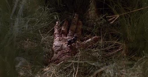 Mind you, it’s probably not the best idea to put us in the decomposing hand’s point of view as it crawls through the grass, sometimes with aargh! a beetle perched on top. I suggest such an attempt at generating chills is not quite as effective as being in the beast’s POV in American Werewolf while it lopes through the woods. The funniest bit arrives when Jon bumps into a dirty, unshaven, profanity-spouting drunken tramp (played by the director himself). The sight of Oliver Stone (creator of some of the most bombastic movies in history) thrashing around on a bunch of cardboard boxes in an alley with a rubbery hand stuck to his throat is priceless, although I was also fond of Caine’s climactic meltdown in which he arm-wrestles, bites and stabs his formerly friendly mitt.