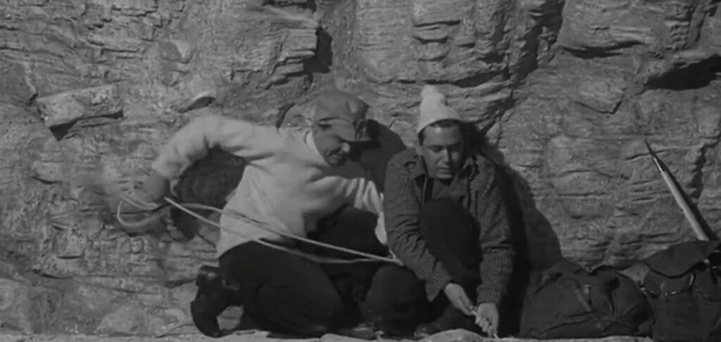 Now for some of the plot! Alan Brooks is actually a professor, a scientist, who was summoned by his associate Prof. Crevett (Warren Mitchell) to an observatory high in the mountains. They are there to supposedly study cosmic rays, but there have been numerous, unexplained (Things happen in the mountains, you know!) accidents involving mountain climbers. These climbers are supposed to be students, but like in Teen-Agers From Outer Space, these are the oldest students I’ve ever seen. They are fat, old men who smoke and have several drinks at the hotel bar before climbing, and with no apparent equipment and stupid looking knit caps. But, that is not important now. What is important is that there are weird things going on at the mountain! A malicious-looking, radioactive cloud is cloaking the peak! Oh My Goat, what could it be?