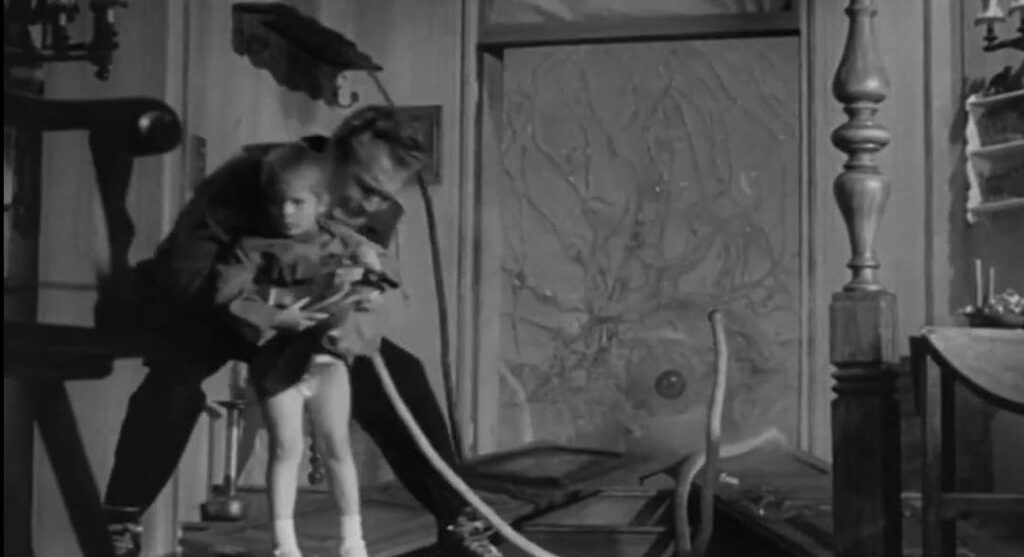 Anyway, back at the hotel, it seems that the two sisters are some sort of traveling psychic show, so they perform for all the men that they have never met, who are smoking and drinking in the hotel. I’ll tell you what. This movie is creepy as Hell, and we haven’t even got to the monsters. Of course, as the Ditzy Sister is ascertaining an unknown object, like Johnny Carson’s Carnack The Magnificent on the Tonight Show, she goes into a trance, swoons and passes out yet another time. This is after she has a vision about one of the “students” (not the fat one) wandering out of the shelter on the mountain.