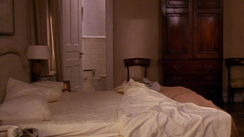When we first meet Larry, it is in flashback at a party where Marion and Ken (Ian Holm) have announced their engagement. Larry is trying one last time to convince Marion that she is making the mistake of a lifetime, but she’s steadfast in her delusion. You see, Marion met Ken in the context of an affair, and as the saying goes, how you get ‘em is how you lose ‘em. No surprise she’ll divorce him years later for the exact same offense. Still, Larry persists: “What can I say to change your heart?” The words are important here, as he makes an irrational, emotionally laden plea in contrast to Marion’s dry recitation of common interests, as if she were closing a real estate deal. He’s after a bold experience; she’s looking to sign a contract. “He’s a prig. He’s cold and he’s stuffy,” he adds. Marion noticeably fails to disagree.