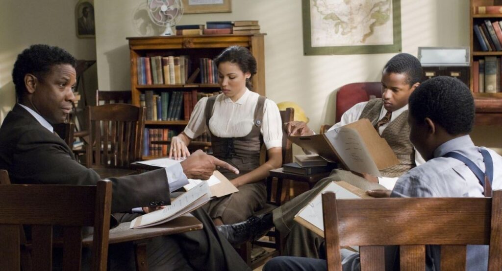 And let’s consider the team itself, shall we? There’s the rebellious young man, Henry Lowe (Nate Parker), who is hand-picked by Tolson because he’s the least likely candidate to be on a debate team. Only the movies, it seems, continue to believe that being ignored and underestimated are the surest signs of a hidden genius. Then we have the sassy female, Samantha Booke (Jurnee Smollett), who stands tall throughout, and though nervous, commands the lectern like Martin Luther King, Jr. in his prime. Before we proceed, you should know that Samantha falls in love with Henry, and the two make love in his shack along the banks of the river, but she eventually walks out on the guy (and the team) because he gets drunk and kisses another woman. Oh, and then there’s the guy-who-is-brilliant-but-will-drop-out-early-because-he-gets-scared character, and it’s no surprise that he takes leave because Tolson’s union organizing starts putting everyone at risk, and he just wants to get an education and stay out of trouble. He’ll cheer the loudest in the end, though.