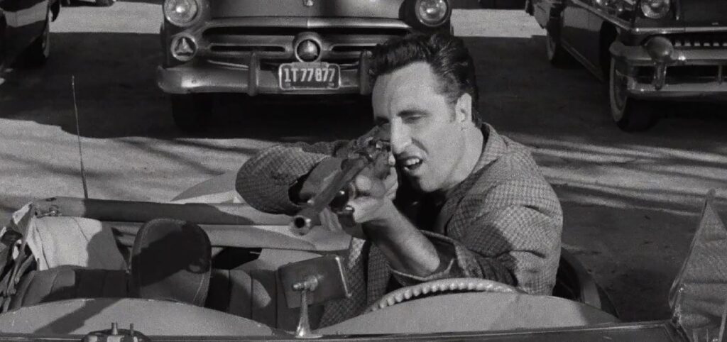 Sherry is a wrench in this carefully orchestrated machinery from the moment her foolish husband lets her catch wind of the plan, expertly pumping George for information that she immediately shares with her aloof lover, Val Cannon (Vince Edwards). After being caught listening at the keyhole of the conspirators’ meeting place and knocked out cold by Johnny, Sherry quickly begins flirting with him and trying to play him as she always has George. Johnny sees right through her, but the damage has already been done, as George feels emasculated and mistrustful of Johnny after the incident. He wants to drop out of the heist, but Sherry has her own plans; she talks him into staying the course with some of the most transparent gold-digging the silver screen has ever known.