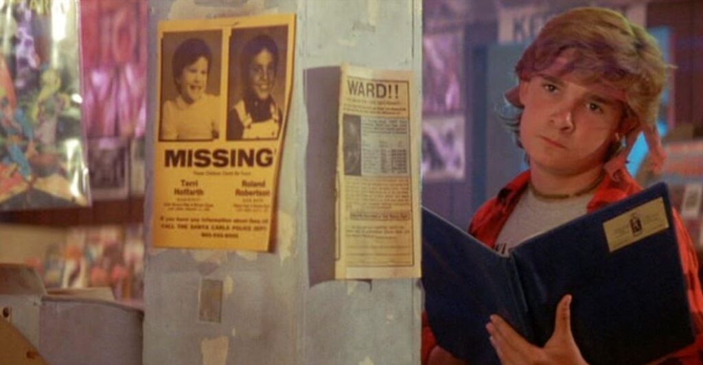 The titular vampire gang represent the youth threat to America as seen by the Reagan administration, except that they’re all white. They are introduced by a clash with law enforcement, and the scourge of Crime in the Streets is so dire in Santa Carla that we later see that same boardwalk cop’s face on one of the dozens of MISSING posters plastered seemingly everywhere in town. When Lucy meets Max (Edward Herrmann) at his video store, he seems to be the upright, Reaganesque hero she needs, with his Zero Tolerance policy for the “wild kids,” while Lucy’s liberal leanings (“We were young once, too; they dress better”) open the door for evil to come into her life and the lives of her sons.