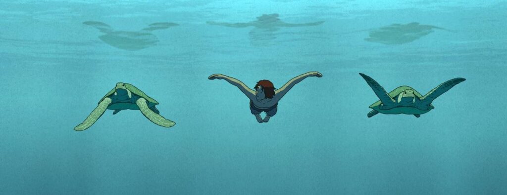 This movie is… something that isn’t easy to name. It isn’t a story in the usual sense, not really, not with dialogue or speeches or explanations. It is the feeling of being there, on the pale sand, watching waves fold over themselves, seeing the red turtle move with patient inevitability, the couple learning, the boy growing, the island breathing along with them. It is about survival, yes, but not the kind that shouts or thrills — survival as meditation, as gentle attention to each moment, to each small gesture that matters. Watching it, you feel time slow.