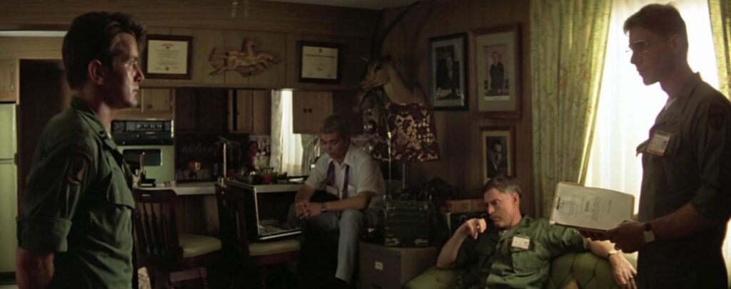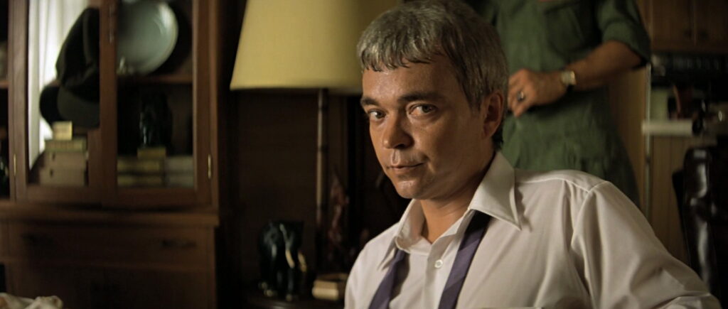 He is everyone and no one. A man of mystery, never to be pigeonholed or defined, yet so real, so tangible, he all but stands in for every G-man who ever lived. Soldier, bureaucrat, and yes, “civilian” (as he’s so named in the credits), he’s the empty vessel you crave when you’re trying to rewrite history, yet, ultimately, the simultaneous roadblock to any alternative but the truth. He says little because his presence is enough. If he’s at the table – and he is, whether sawing away at his food with purpose or partaking of a cigarette – it’s a meeting you can’t afford to miss. He’s akin to The Godfather Part II’s Vincenzo Pentangeli, staring intently from the gallery; wordlessly, effortlessly reminding Frankie Five Angels of the stakes. He’s comfortable, casual – the ultimate enigma – and the only reason we’re even here. And whether we leave, or don’t, or wrap up with a hasty retreat, he’ll be the explanation for it all. He’s everything the Vietnam War was, is, and ever will be, for better or worse. Given the ultimate result, we’ll stick with the worst.