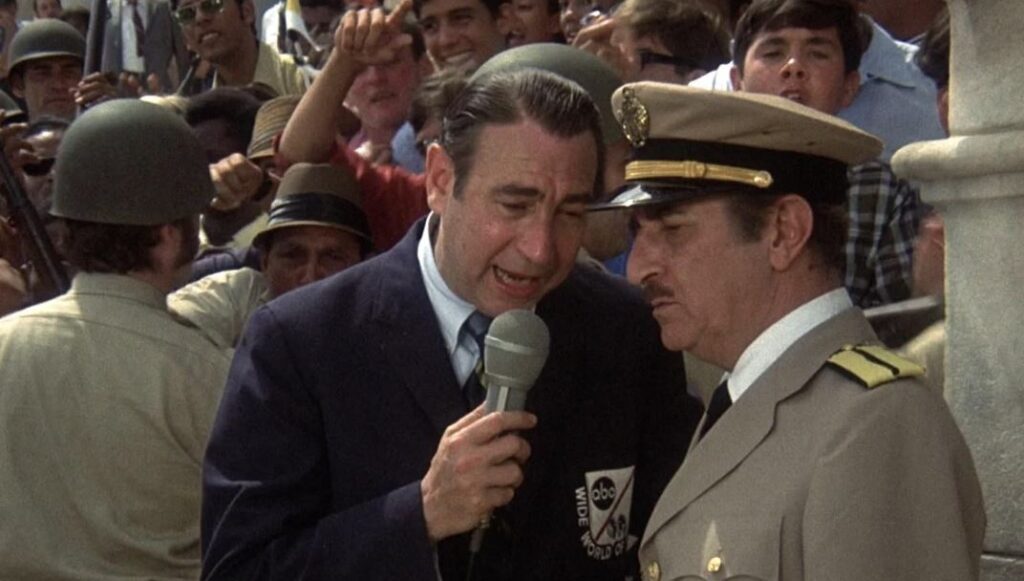 “This is tremendous, Don, just tremendous. The atmosphere heavy, uncertain, overtones of ugliness. A reminder, in a way, of how it was in March of 1964 at Miami Beach when Clay met Liston for the first time and nobody was certain how it would turn out. The crowd is tense; they’ve been here since ten this morning. And… and I think I see… the door beginning to open. El Presidente may be coming out. The door opens. It’s he… it’s El Presidente waving at the crowd. A shot rings out! He turns… he runs back toward the building, trying to get in. This crowd is going wild. He’s caught in a crossfire of bullets. And down! It’s over! It’s all over for El Presidente!”