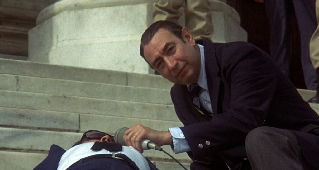 And yet, despite the weight of being witness to murder and revolution, Howard proved for all time he’s just as deft with a lighter touch. If love is in the air, he’ll be there too, press credentials at the ready, offering the sort of play-by-play unseen until Roone Arledge changed the world. Lovemaking reduced to pugilistic passion. Yes, it’s Woody’s idea, but I’m sure Cosell had a hand in the origin story. Sex and violence quite reasonably transformed into mere spectator sports, bankrolling a nation careening towards doom. Inevitable, so you may as well laugh.
