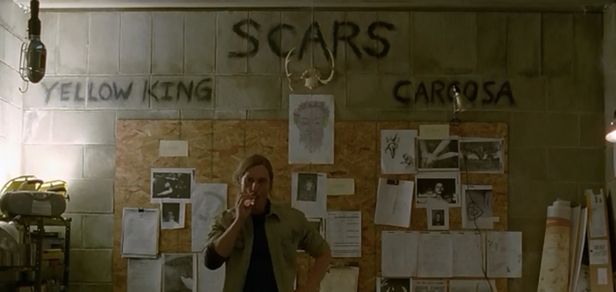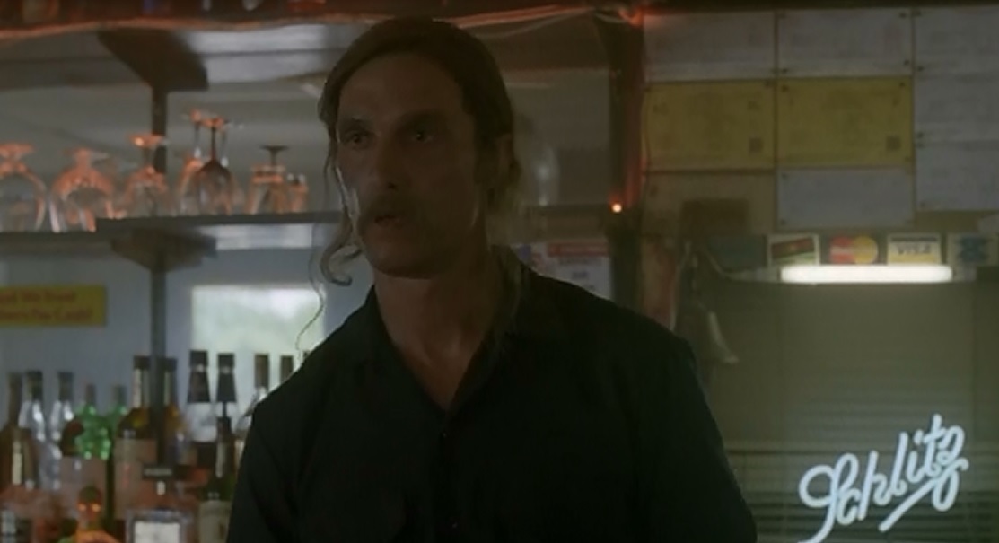 Massie is undercover and he’s getting too close. He gets word from higher up that the investigation is being terminated. He suspects a cover-up so he quits the force and lives full time as a cult member, drinking babies and having orgies. Somewhere in there, he starts to believe he is transforming. He’s conflicted here. I mean, he doesn’t like drinking babies. He probably thinks they taste bad and it’s evil; however, he has all these cool new powers like telekinesis. Plus, these kids were bred to be killed anyway. It’s not like they were going to attend Yale and cure cancer. Also, all kinds of kinky sex. So he goes along with it until he’s just drunk one baby too many. Then, he snaps and kills off all the leaders or at least blackmails them. The cult is disbanded and Massie loses his superpowers after a while, but the world is a little safer. He drifts across South Louisiana doing odd jobs just telling his tale to people he felt comfortable with. I like to picture him tending some smokey, backwoods bar in LaFitte or Venice, Louisiana. Nic walks in looking to have a drink and the rest is history. It explains why the cult members all seem to recognize Cohle. Could this be an inside joke between Massie and Pizzolatto?