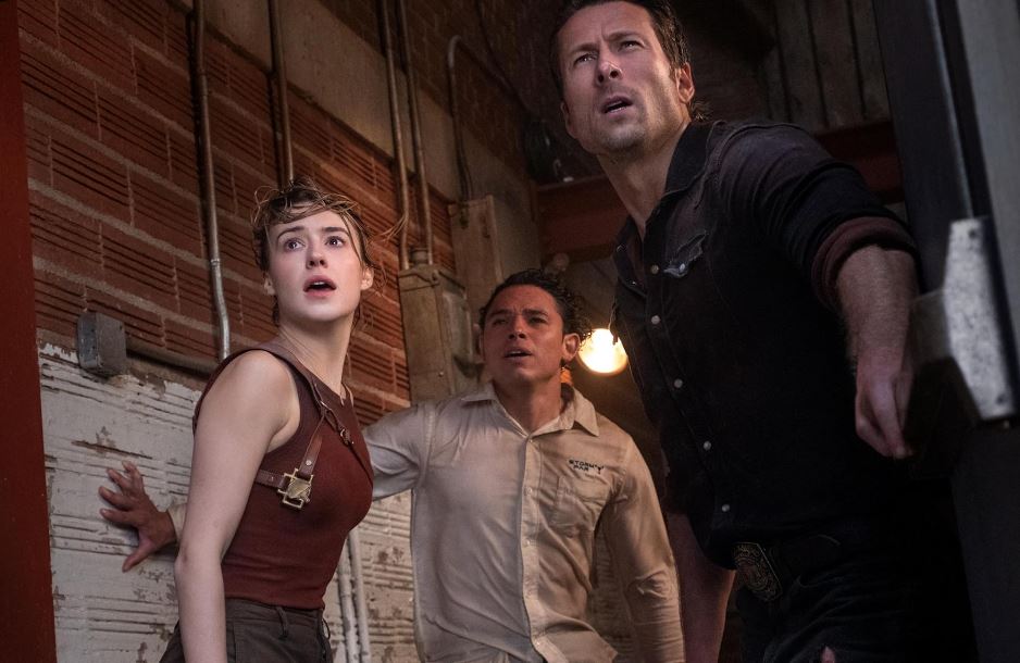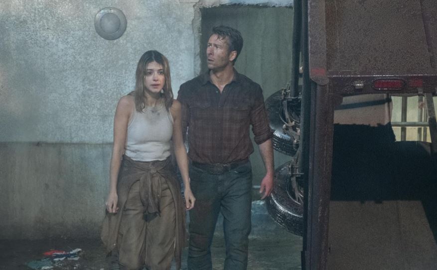 Then, riding in on a tornado-proofed truck comes Tyler (Glen Powell). Tyler is a YouTuber and self-proclaimed Tornado Wrangler who records himself doing dangerous stunts while storm chasing. Tyler is going to mug and wink, then flirt with Kate until it’s time to chase a storm. Tyler is accompanied by a motley crew of people in varied outfits and vehicles (just like in the first movie), including a junky truck/RV. See what they did there? Tyler’s on the good-guy team, but *whispering* doesn’t know it yet.