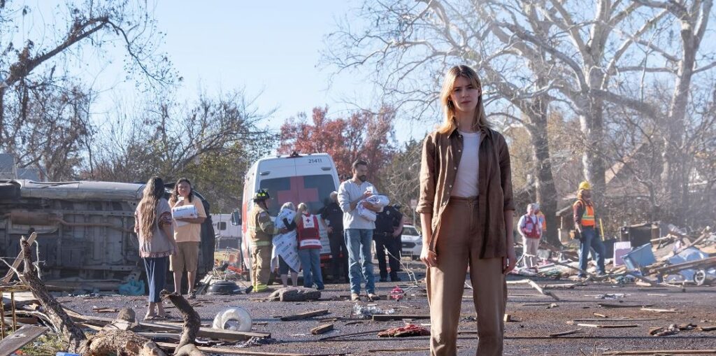 It’s pretty obvious Twisters is actually a remake of Twister, unfolding almost identically. Like all remakes that aren’t shot-for-shot, some components have been tweaked or slightly rearranged. The film opens like the original did – in the past – with our main character Kate (Daisy Edgar-Jones), a young idealist intent on conquering the mystery of tornados. Like Bill from the original movie, Kate has a magical ability to know where tornados will show up and what they will do. She and her friends hope to make a scientific breakthrough and attempt to dissipate a tornado with an experimental chemical solution (which fails). But it ends in tragedy at the hand of a massive tornado.