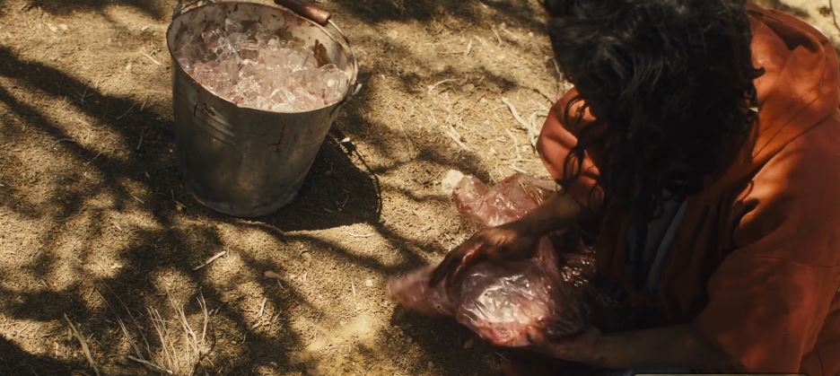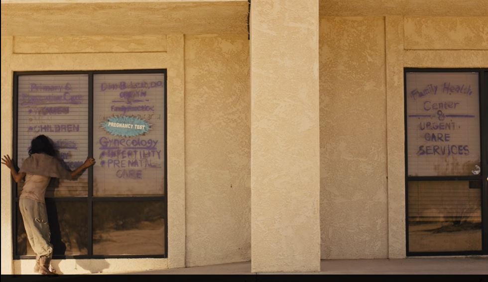 It’s here that I’ll mention the water bottle, which feels like a pitch meeting prop destined to become behind-the-scenes lore, while serving onscreen as an extension of Mowanza’s wiry, straining arms. With the film’s ominous title and parched horizons, water is obviously a critical element, and a thin plastic drinking bottle dangling from a leather strap provides some excellent connections between Mowanza and the motley characters she meets on her jagged, hazardous pilgrimage to the town of Iropus, a place purported to offer utopian technology and, forbidden outside its borders, the promise of abortion surgery.