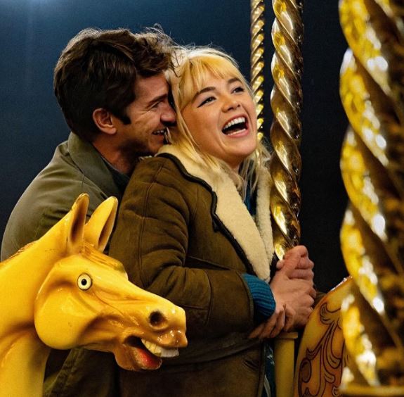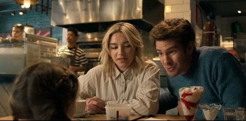 We Live in Time shows us the story of Almut’s (Florence Pugh) and Tobias’ (Andrew Garfield) relationship. For those of you that like your stories linear, this is not the film for you. The story is presented to us in three timelines, jumping back and forth between the timelines throughout the film. Like an episode of Lost, but without polar bears and smoke monsters.