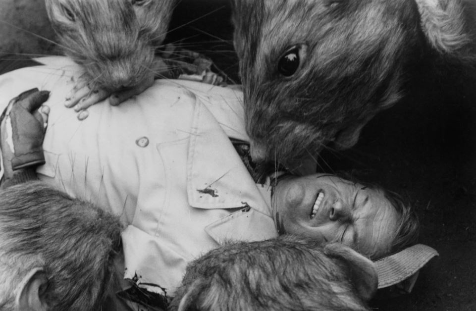 And so, a baby is born, Mrs. Skinner is gnawed to death on a pile of her peaches, and Morgan heads out with Thomas to blow up the dam. Two small sticks of dynamite should be enough, and they’re off! Everyone climbs to the roof as the water rushes forth, drowning every rat not blown apart by Morgan’s shotgun. As expected, the white rat is the last to die. A good five minutes are devoted to the Biblical flood, where rats are suffering, screaming, and falling lifeless to the bottom of the newly created lake. At this point, I couldn’t help but wonder if actual rats were harmed during filming. When they’re shot, the wounds look pretty damn real, and it would be difficult with 1976 technology to send stuffed animals to their watery doom. PETA wasn’t a force back in those salad days of the disaster pic, but even a plague survivor would be hard-pressed to agree that killing hundreds of rats for some drive-in feature could ever be worth it. Unless of course you also actually killed Ida Lupino.