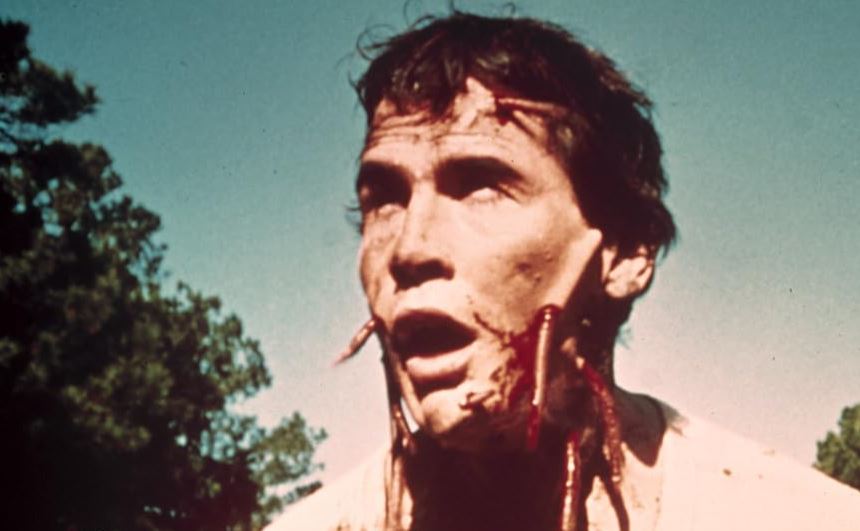 Before we can collect our thoughts, Mick and Geri decide to go fishing with Roger, who spends most of the boat trip grabbing at Geri’s ass. His sexual urges at last released, he’s punished most horribly by falling into the lake, popping up to reveal a face covered with gnawing worms. They’ve even managed to grind under the skin, adding to Roger’s unholy pain. He runs off to the swamp, leaving Geri to swim through the same body of water unharmed.