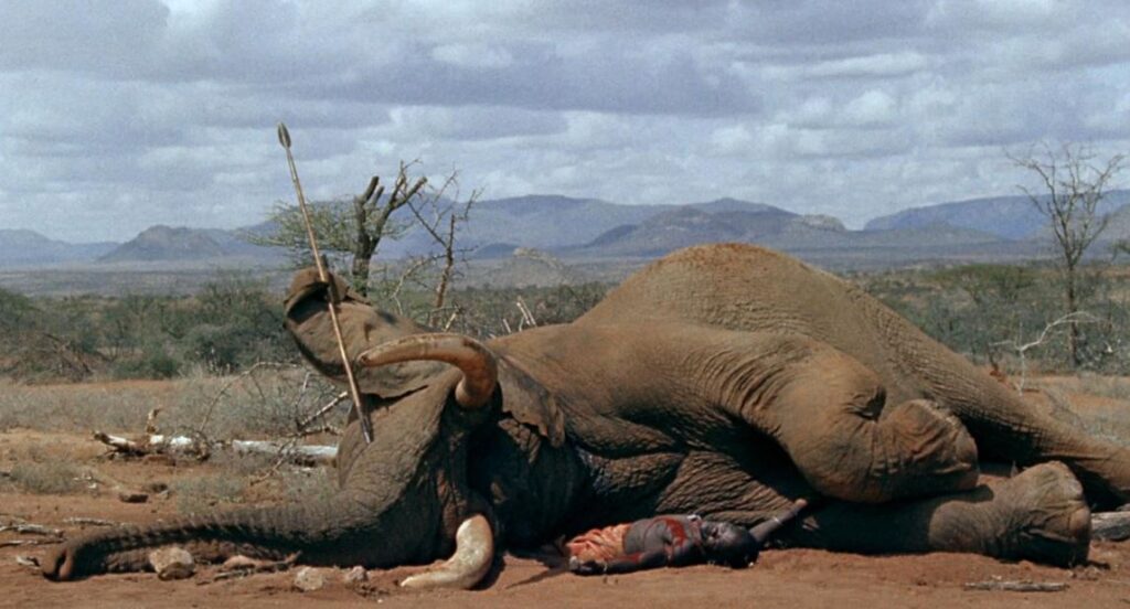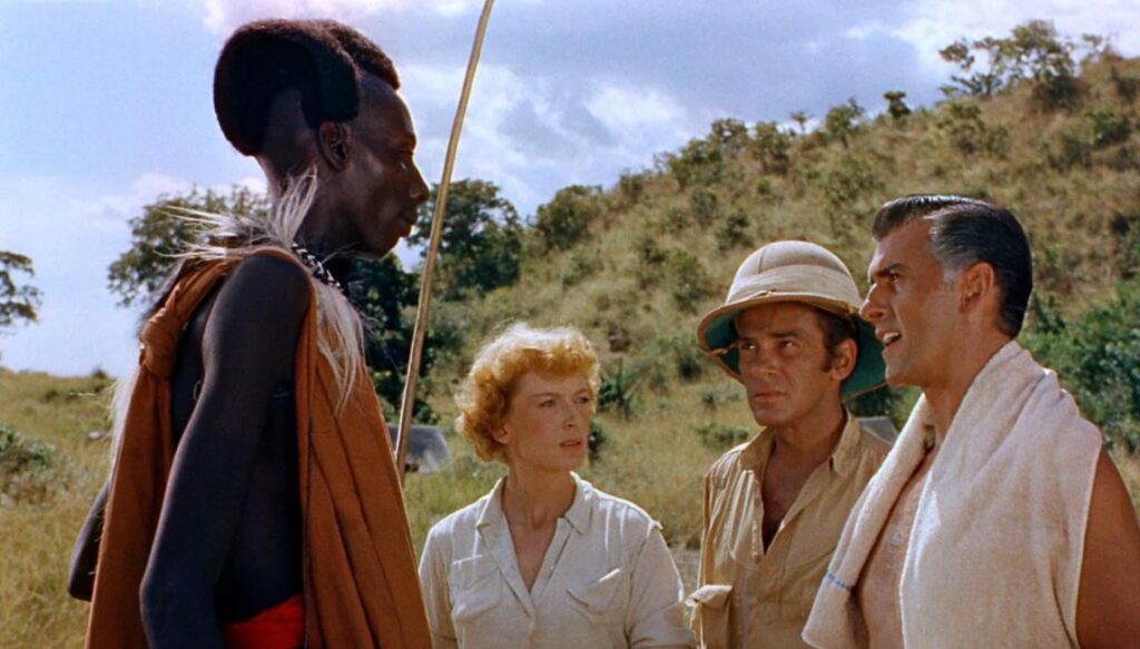 Other delights abound. Kerr deciding at waterfall’s edge to crudely remove the entirety of her hair with dull scissors, only to appear in the very next scene looking as if Vidal Sassoon himself had been airlifted into sub-Saharan Africa. Granger (as Allan Quatermain) thrusting himself center screen not once, but six times, shirtless, shaved, and bronzed to perfection. The actual killing of an elephant (Africa lacks a PETA chapter, apparently). More faceless and nameless African tribesmen than have ever been featured in a Hollywood production. A good half hour of stock footage featuring stampeding giraffes, half-crazed alligators, and cheetahs on the prowl. And walking. Lots of walking. Followed by the setting up of tents, Kerr screaming, and a shot or two being fired in the direction of a snake. Oh, and Kerr collapsing from the heat. I stopped counting when it reached double digits.