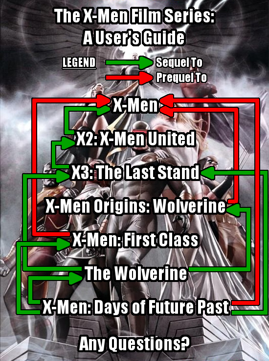 In short, all of these movies have had their problems, and none of them have really felt like X-Men movies to me. So where does X-Men: Days of Future Past come in? Bizarrely enough, it is both a direct sequel and an indirect prequel to the previous film in the series, The Wolverine. Yes, it’s full of time travel shenanigans, retcon-overdrive, and that most American of ingredients: bullshit. In case you’re confused, I made up this handy chart for us. Hopefully it explains where this film sits within this clusterfuck of a film series: