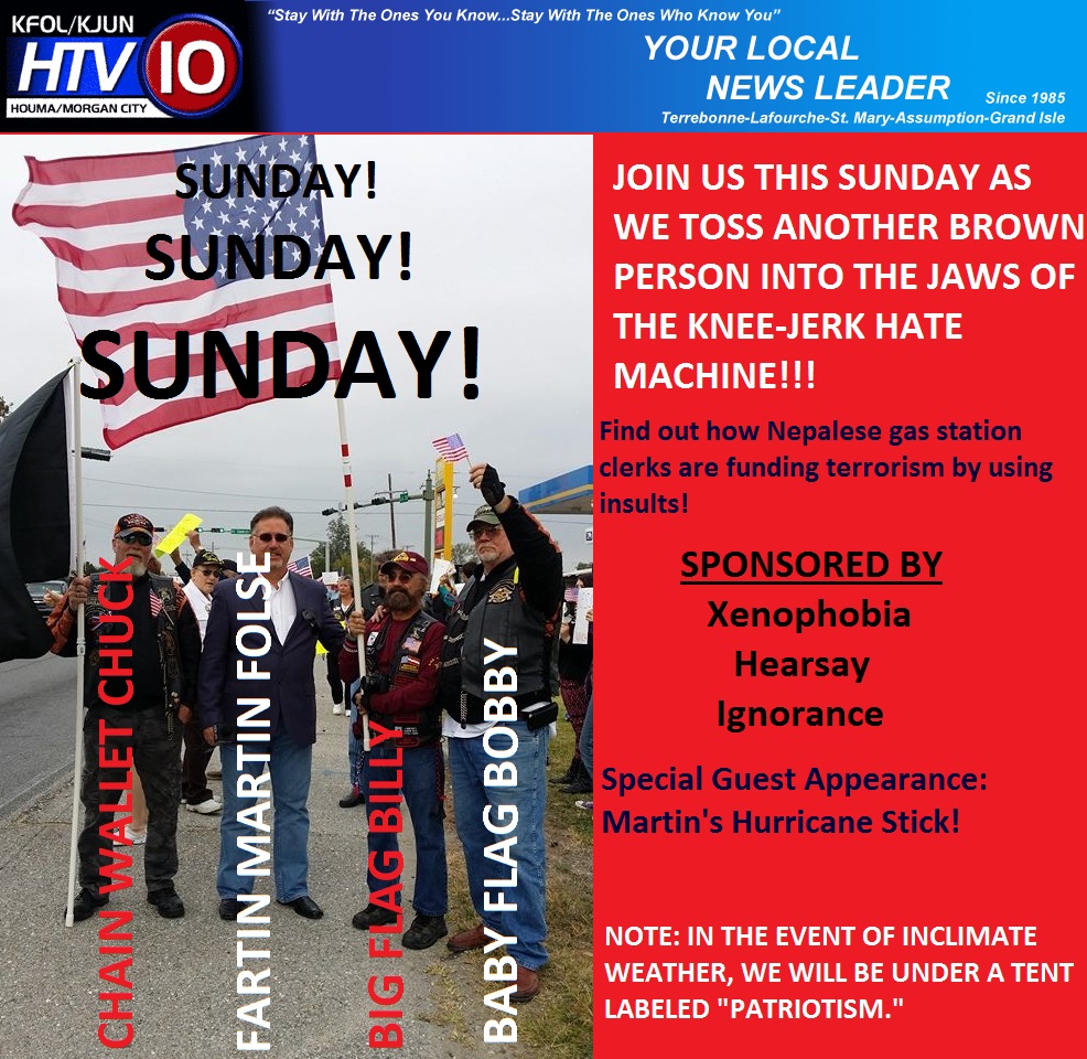 The reason people even have HTV is because of a law that states cable providers must carry local channels. Martin Folse happens to broadcast a very weak signal (I couldn’t get it when I lived five miles from his station), which forces cable companies to carry HTV because it is tasked with informing the public. An added bonus for Martin is that he also gets to charge for advertising. The veteran who told Martin he was insulted at that gas station just so happens to have a business that frequently advertises on HTV. When it comes down to it, a man of Martin’s mettle didn’t stand a chance. He could either appease an advertiser in the name of patriotism to gain publicity, or he could just not slander a minority-owned business that contributes nothing to his advertising revenue. The choice was made for him before the earth was even formed. You can get very far in America taking advantage of minorities, or at least you could. Folse probably didn’t expect the kind of backlash he received because he thought if you wrapped a turd burger in patriotism, the people of south Louisiana would eat it right up. Unfortunately for Martin, many of us smelled shit through the wrapper.