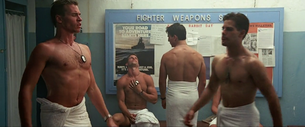 In class, Maverick is a dork. His instructors tell him where he erred, and his first response is to retort “There’s no time to think up there.” Oh really? If instinct is all that matters, then there is no point to a fighter school, then. Way to insult everyone in the room, dick-feather. Otherwise, you need to shut the fuck up and pick up some instincts, reflexes, or both of them shits, because you suck at this. Meanwhile, the teacher states “Now let’s look at an example of excellent combat.” She need not name Iceman, we already know he is the best. Naturally, Maverick runs out like a bitch, whining that his instructor won’t give him a break because she digs his umbilicus-like penis. Ice didn’t seem to have that problem, but then he already fucked his instructor.