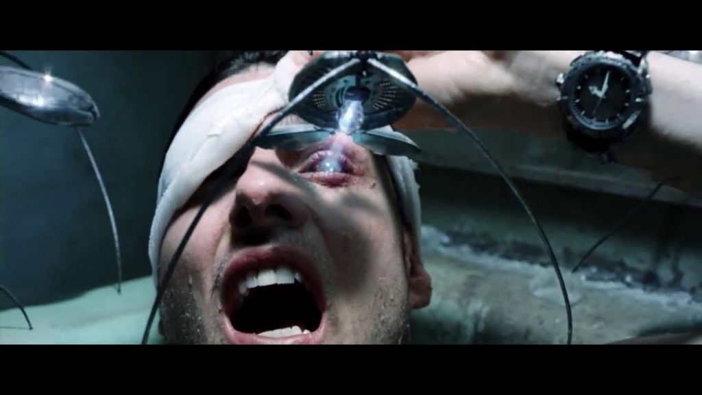 Tom Cruise has to go on the run after it’s revealed he’s about to murder a man he’s never met. Hunted by his Precrime cop colleagues, he holes up in an apartment block to recover from a gruesome eye operation that will help obliterate his identity. It’s no good, though, and he’s located. Eight spider robots with an array of mind-blowing sensors are sent in after him. It has to be said that these three-legged, eye-scanning technological marvels are as cool as fuck. They’ve even got their own headlight.