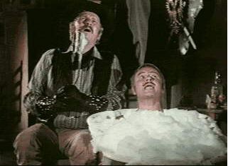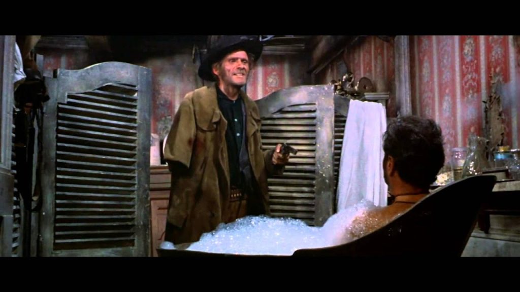 Later on, after a series of nefarious schemes to snatch the land from the good people of Rock Ridge has failed, Lamarr is soaking in a tin bath trying to think of another idea. Taggart, ever the devoted subordinate, sits alongside scrubbing his back with a brush. As usual, his witless blathering annoys Lamarr.