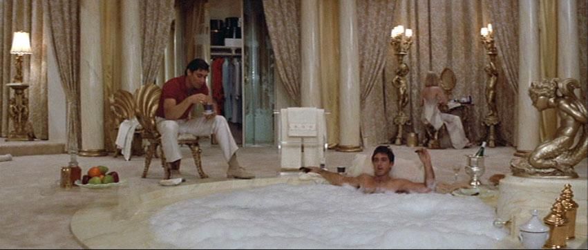 At any rate, most of the apoplectic criticisms leveled at Scarface centered on its excessiveness. Excessive profanity, excessive drug snorting, excessive violence, excessive… well, everything. For me, it’s this excessiveness which gives the movie its tangy, memorable flavor. Nothing captures that better than the scene of Tony having a dip. It’s just the perfect metaphor for excess. I mean, have you ever seen a tub like this?